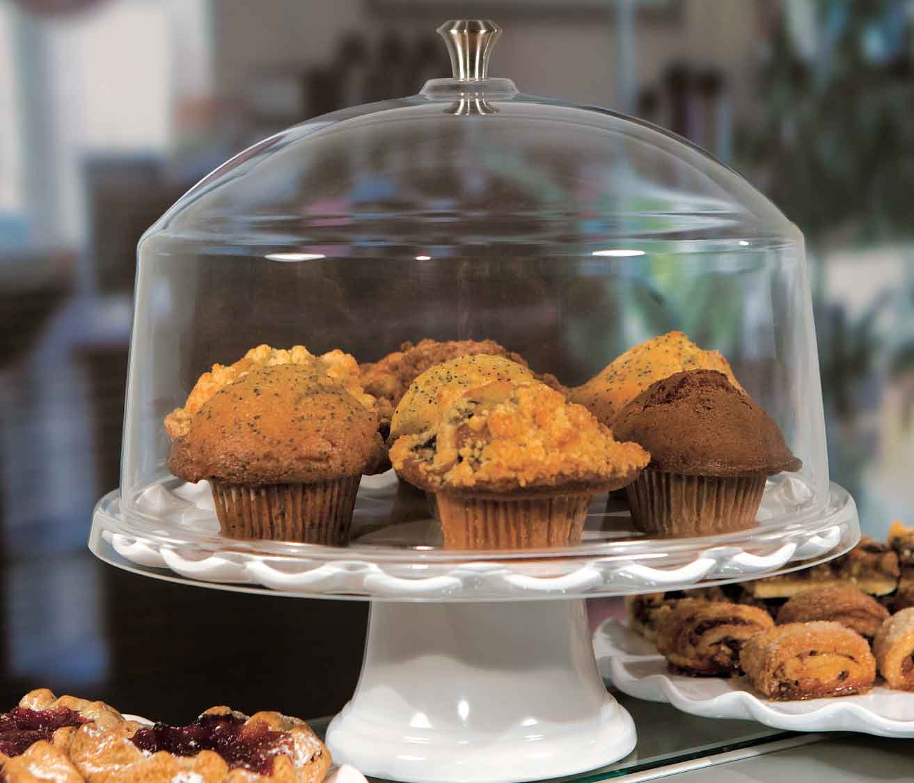 Accented with a beautiful brushed stainless steel handle, this well designed dome offers maximum interior space and a classic design. Crystal clear, designed for use with our Ruffle Tray or Carrara Disc series.