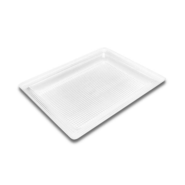 With a proprietary patterned bottom, Delfin Prism Trays sparkle beneath your bakery offerings. Standard sizes designed to work with any industry dome or cover. Not recommended for hot case use.